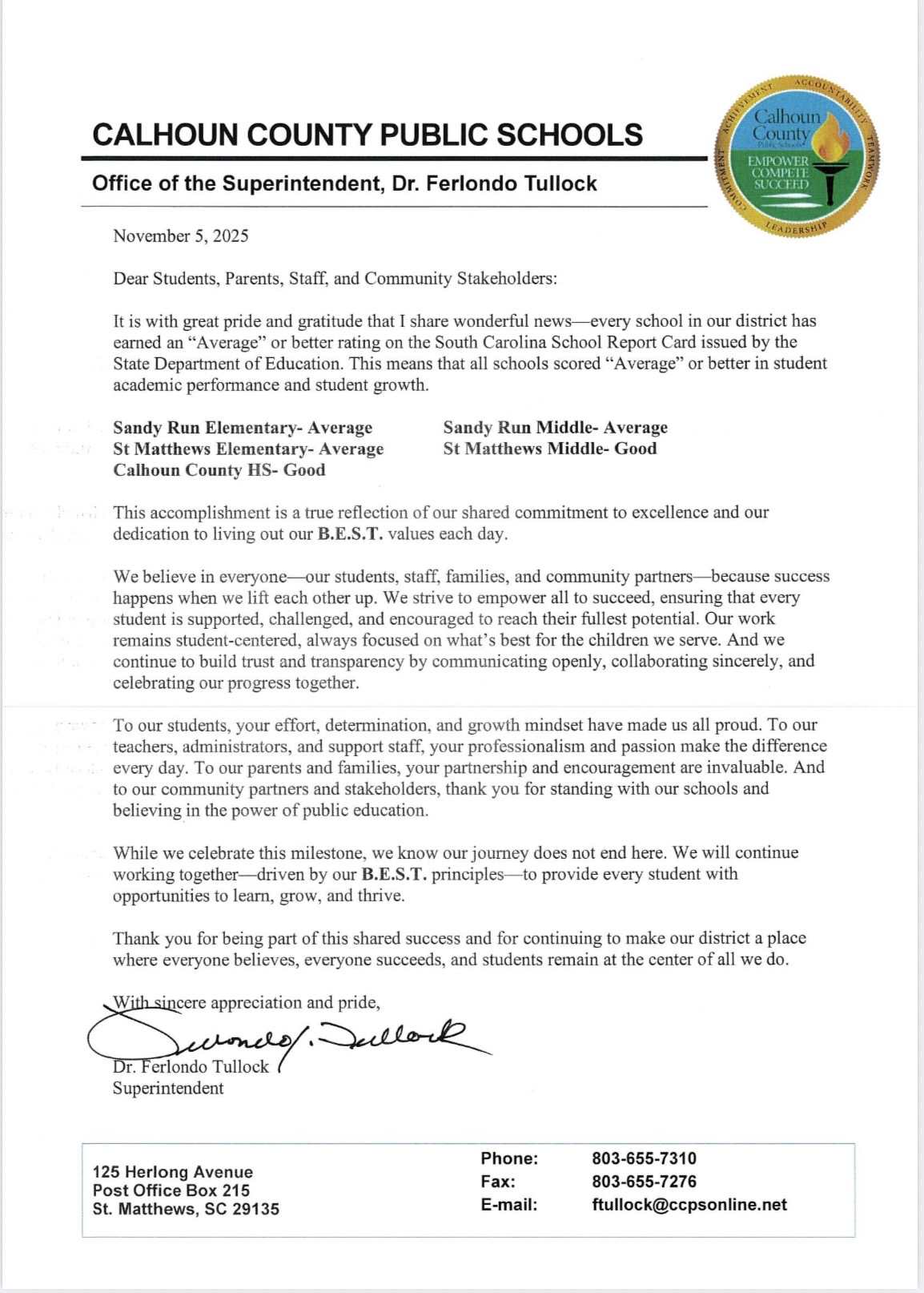 Calhoun County School District continues its focus on "Teaching and Learning". Our mission is to empower all students to compete and succeed in an ever-changing global society. We encourage excellence from students as our teachers are dedicated to providing them with quality instruction and experiences. Our students are given an array of opportunities to participate in clubs, athletics, science fairs, Montessori Instruction, STEM Initiatives, field trips and other opportunities designed to enhance their learning process.